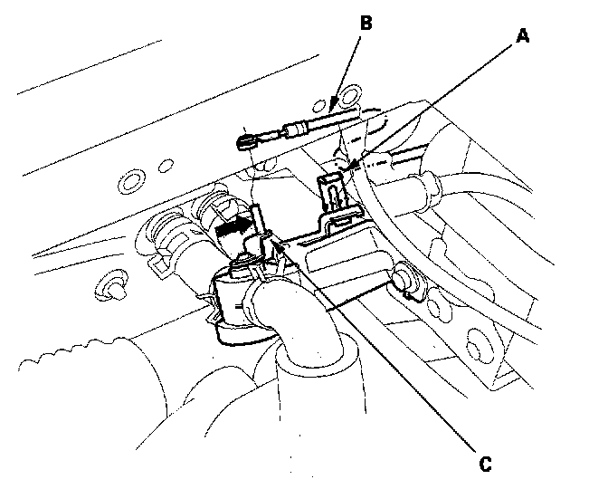 2. From under the hood, open the cable clamp (A), then disconnect the heater valve cable (B) from the heater valve arm (C). Turn the heater valve arm to the fully opened position as shown.