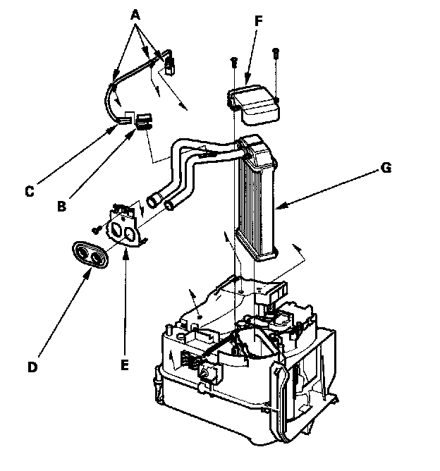 10. Remove the clips (A), the sensor clamp (B), and the heater core temperature sensor (C). Remove the grommet (D), then remove the self-tapping screw and the pipe bracket (E). Remove the self-tapping screws and the core cover (F). While being careful not to bend the inlet and outlet pipes. Pull out the heater core (G).