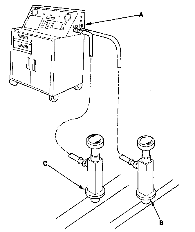 1. Connect a R-134a refrigerant recovery/recycling/charging station (A) to the high-pressure service port (B) and the low-pressure service port (C), as shown, following the equipment manufacturer's instructions.