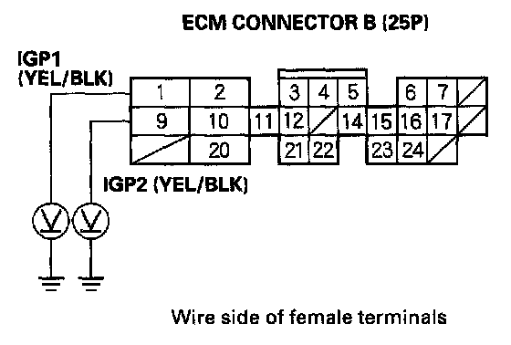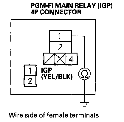 19. Disconnect each of the components or the connectors below, one at a time, and check for continuity between PGM-FI main relay (IGP) 4P connector terminal No.1 and body ground.