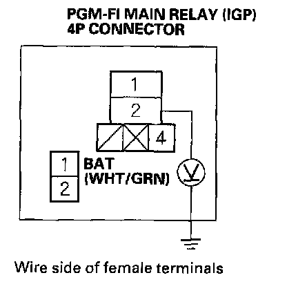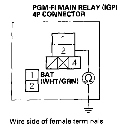 18. Check for continuity between body ground and the PGM-FI main relay (IGP) 4P connector terminal No.2.