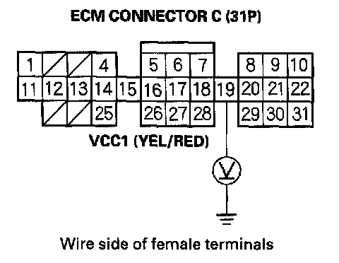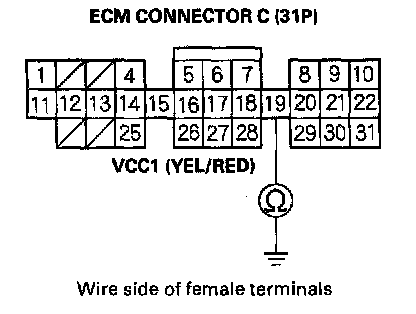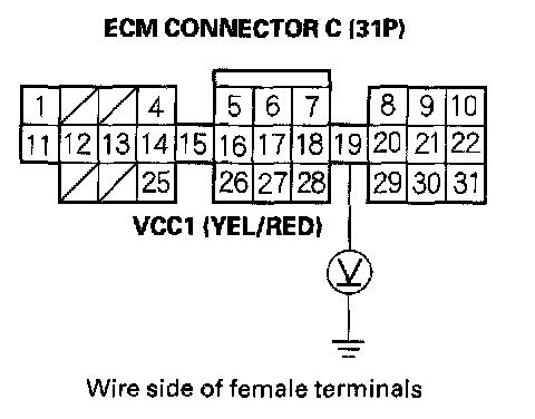 38. Measure voltage between body ground and ECM connector terminal C19.