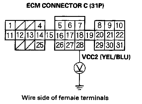 48. Disconnect the 3P connector from each of these sensors, one at a time, and measure voltage between body ground and ECM connector terminal C28 with the ignition switch ON (II).