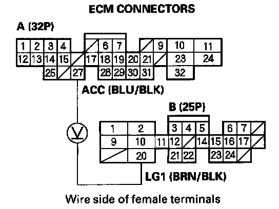 14. Check for continuity between body ground and ECM connector terminal A27.