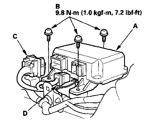 1. Install the new SRS unit (A) with Torx bolts (B), then connect the floor wire harness 18P (C) and 8P (D) connectors to the SRS unit; push them into position until they click.