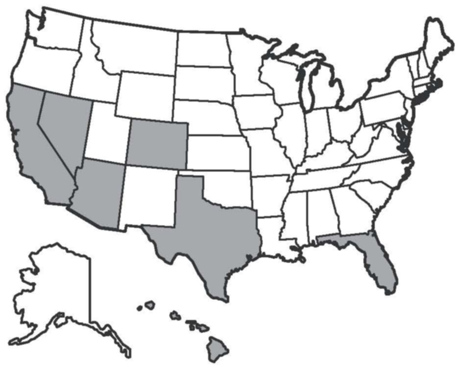 This product update affects all 2000-04 Insights registered in the states of Arizona, California, Colorado, Florida, Hawaii, Nevada, and Texas, the shaded states on this map) as shown.