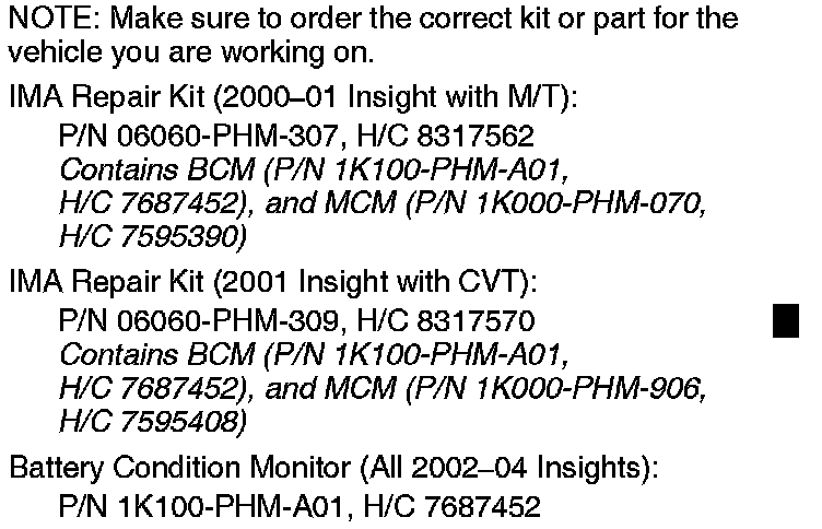 Based on the model and/or model year, install the appropriate IMA repair kit or part.
