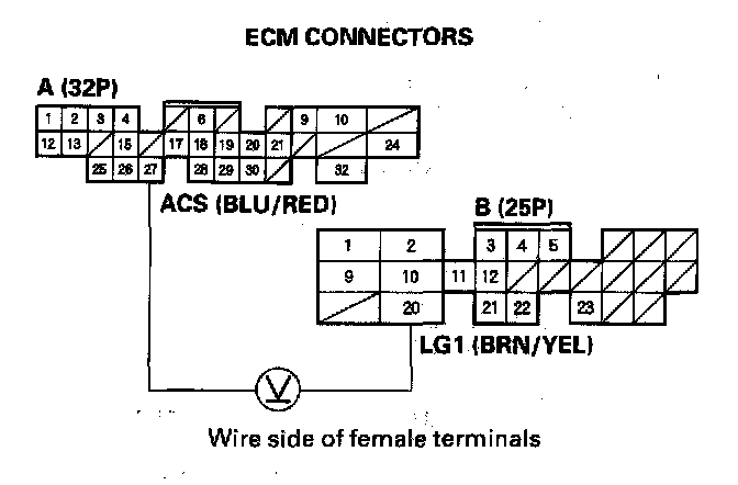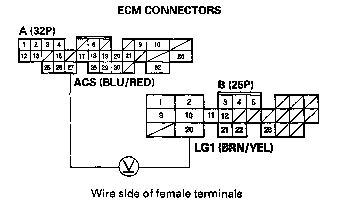 4. Measure voltage between ECM connector terminals A27 and B20.