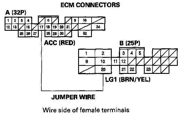 8. Momentarily connect ECM connector terminals A17 and B20 with a jumper wire several times.