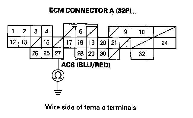 14. Check for continuity between body ground and ECM connector terminal A27.