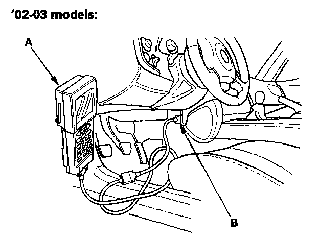 2. If the MIL stays on, connect the Honda PGM Tester (A) or an OBD II scan tool to the data link connector (DLC) (B).