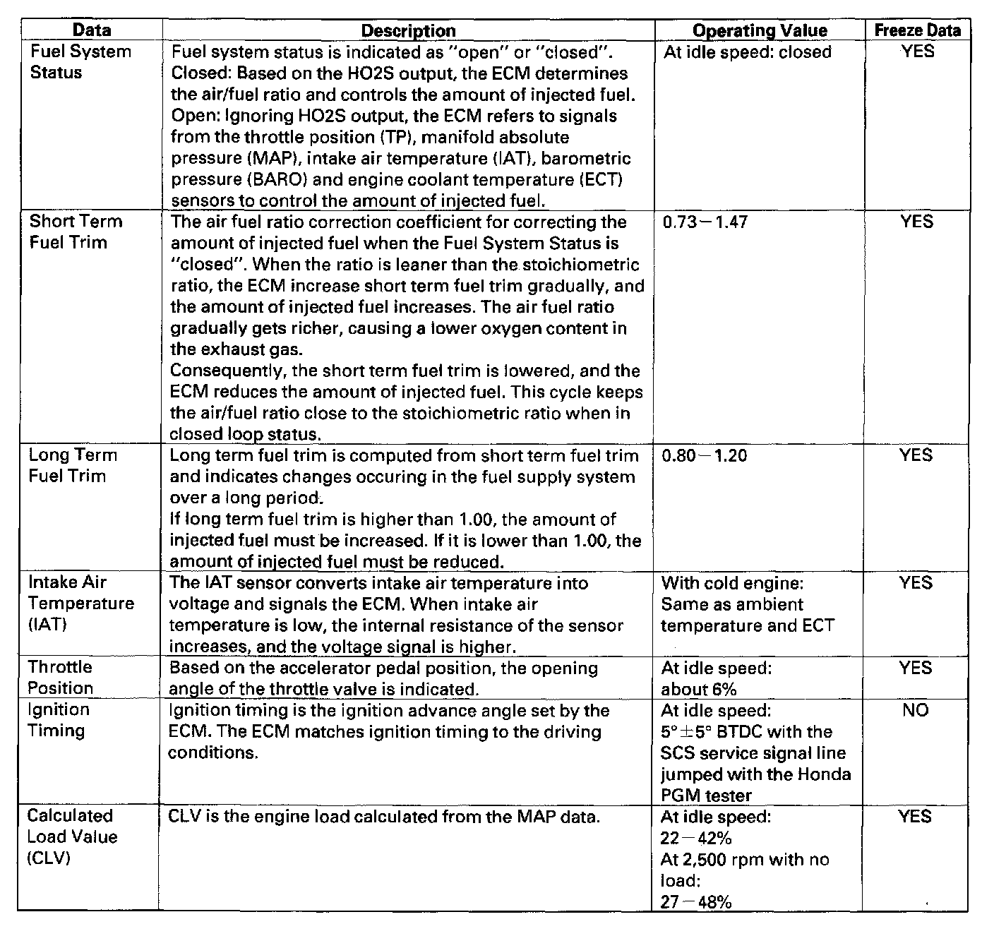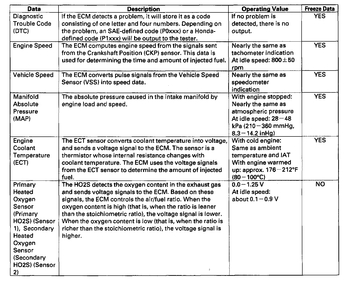 ECM DataYou can retrieve data from the ECM by connecting the OBD II scan tool or the Honda PGM Tester to the Data Link Connector (DLC). The items listed in the table conform to SAE recommended practice. The Honda PGM Tester also reads data beyond that recommended by SAE to help you find the causes of intermittent problems.