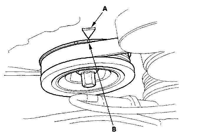 6. Aim the light toward the pointer (A). Check the ignition timing under no load conditions: headlights, blower fan, and air conditioner are not operating. If the ignition timing differs from the specification, replace the Engine Control Module (ECM).