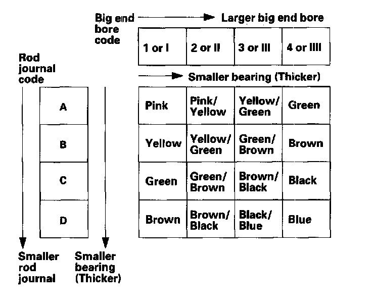 4. Use the big end bore codes and rod journal codes to select appropriate replacement, bearings from the table.