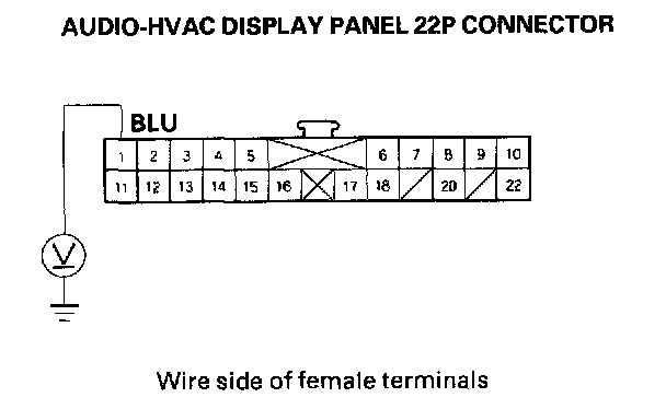 10. Measure the voltage between the No.1 terminal of audio-HVAC display panel 22P connector and body ground.