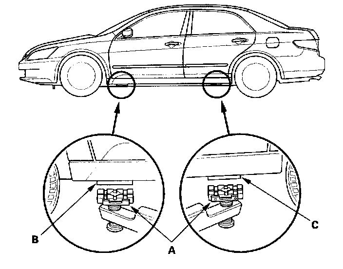 1. Position the hoist lift blocks (A), or safety stands, under the vehicle's front support points (B) and rear support points (C).