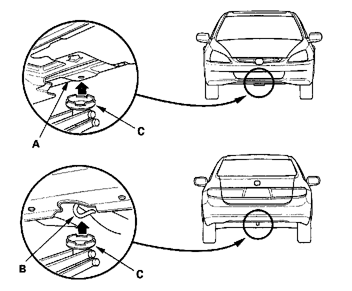 3. Position the floor jack under the front jacking bracket (A) or rear jacking bracket (B), center the jacking bracket in the jack lift platform (C), and jack up the vehicle high enough to fit the safety stands under it.