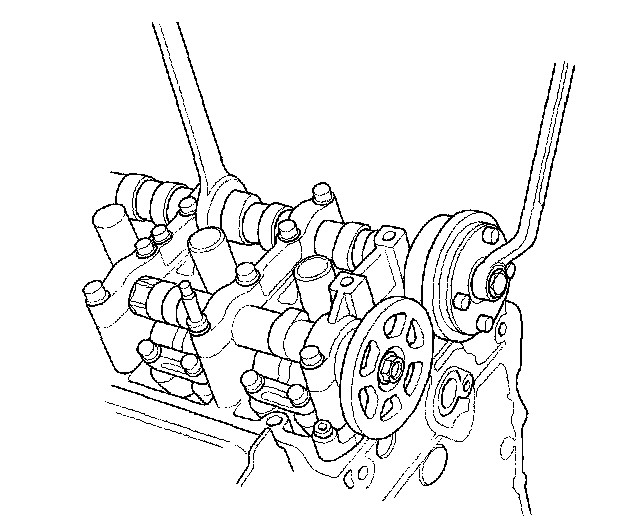 2. Hold the camshaft with an open-end wrench, then loosen the variable valve timing control (VTC) actuator mounting bolt and exhaust camshaft sprocket mounting bolt.