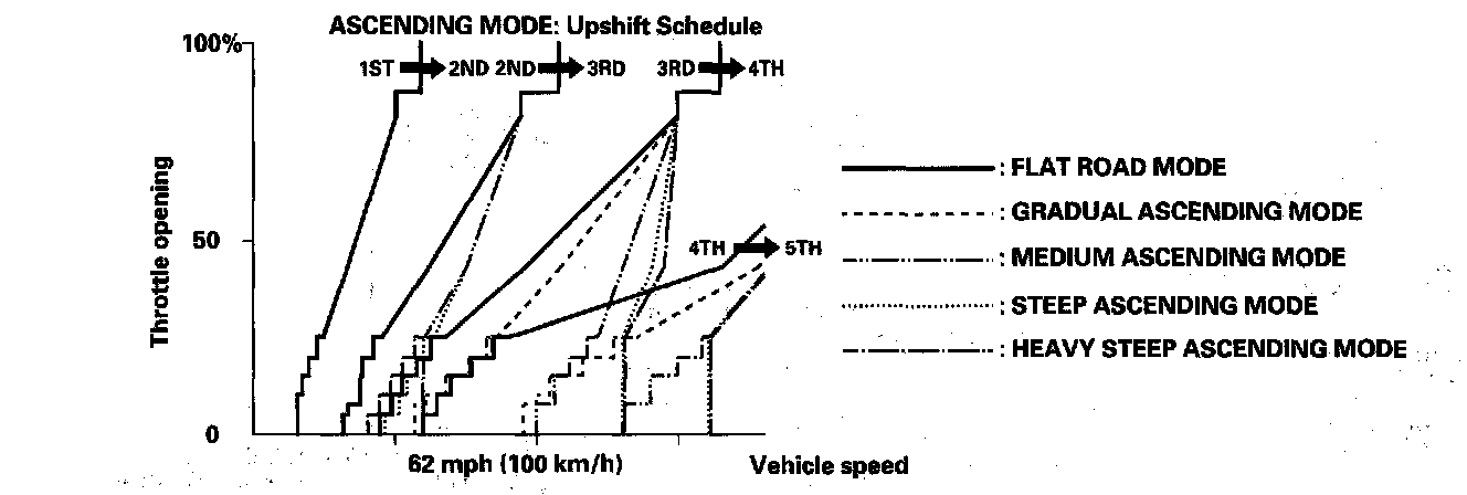 Shift schedules stored in the PCM between 2nd and 3rd gears, between 3rd and 4th gears, and between 4th and 5th gears, enable it to automatically select the most suitable gear according to the magnitude of a gradient.