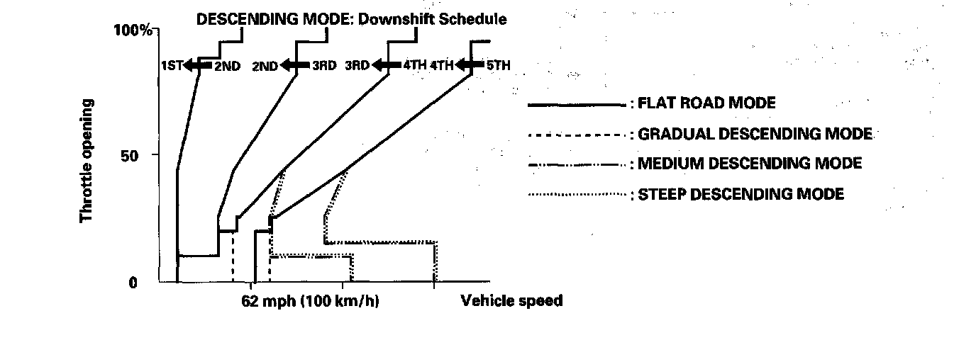 When the PCM determines that the vehicle is going down a hill in D and D3 positions, the shift-up speed from 4th to 5th gear, from 3rd to 4th gear, and from 2nd to 3rd gear (when the throttle is closed) becomes faster than the set speed for flat road driving to widen the 4th gear, 3rd gear, and 2nd gear driving area. This, in combination nation with engine braking from the deceleration lock-up, achieves smooth driving when the vehicle is descending. There are three descending modes with different 4th gear driving areas, 3rd gear driving areas, and 2nd gear driving areas according to the magnitude of a gradient stored in the PCM. When the vehicle is in 5th gear or 4th gear, and you are decelerating when you are applying the brakes on a steep hill, the transmission will downshift to lower gear. When you accelerate, the transmission will then return to a higher gear.