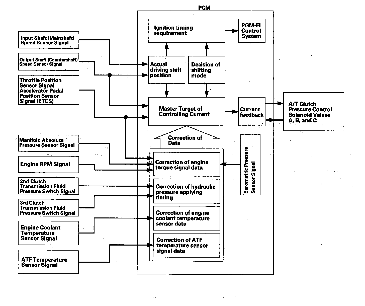 The PCM receives input signals from the various sensors and switches, performs data processing, and outputs a current to the A/T clutch pressure control solenoid valves A, B, and C.