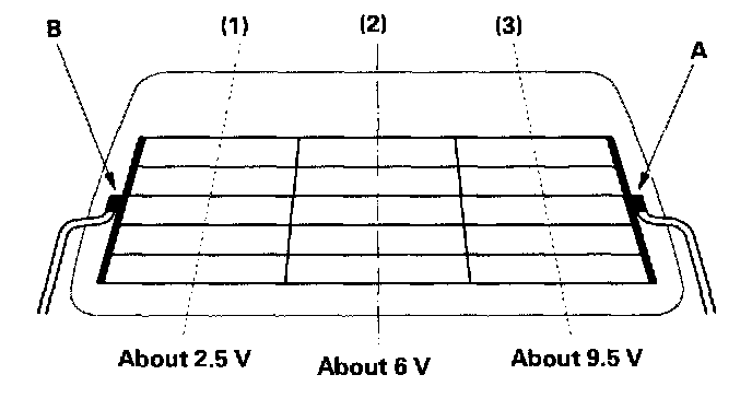 1. Check for voltage between the positive terminal (A) and body ground with the ignition switch and defogger switch ON.