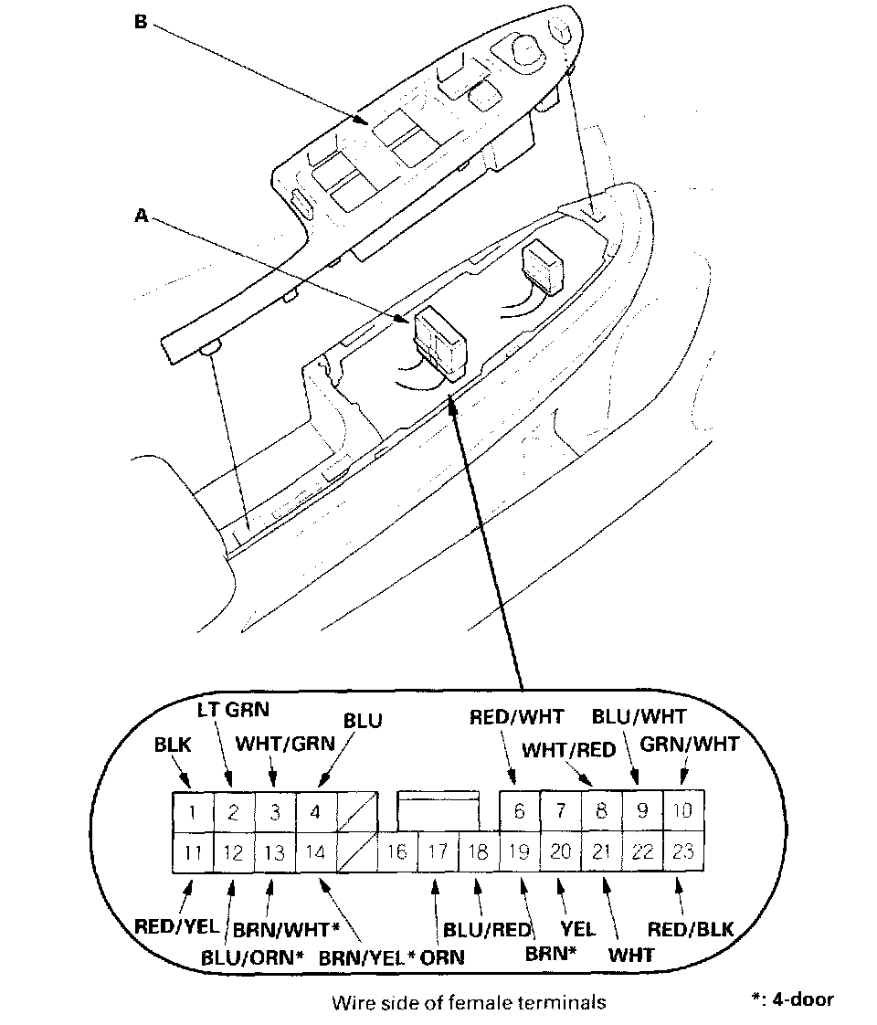 3. Disconnect the 23P connector (AI from the power window switch (B).