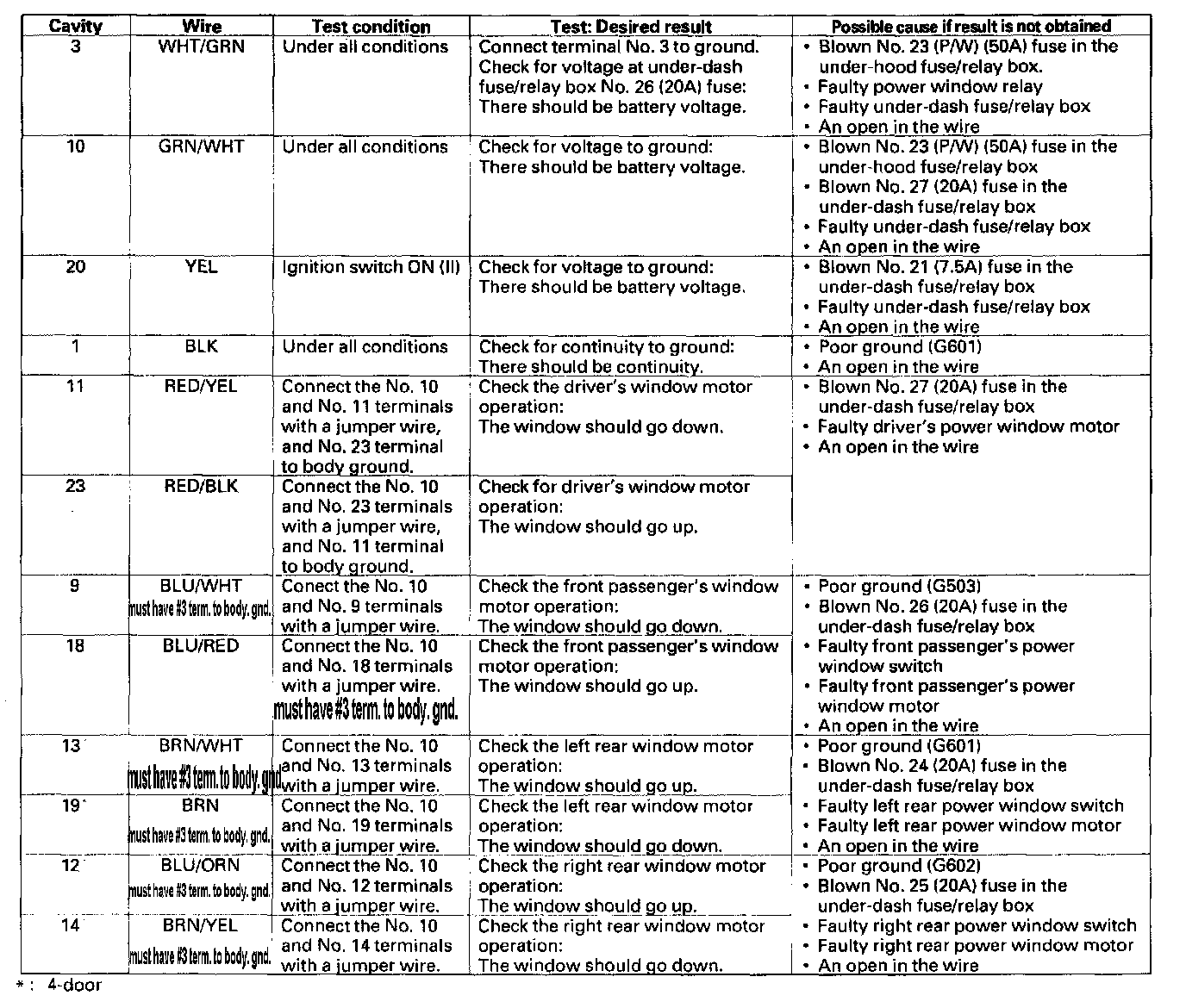 NOTE:Technicians please note that several cavities require the number 3 terminal to be grounded to a body ground this is noted in either the wire color cell or test condition cell this only applies to the cavities noted all other instruction to be followed as presented, due to manual update from OEM. Aug.19th 2005.