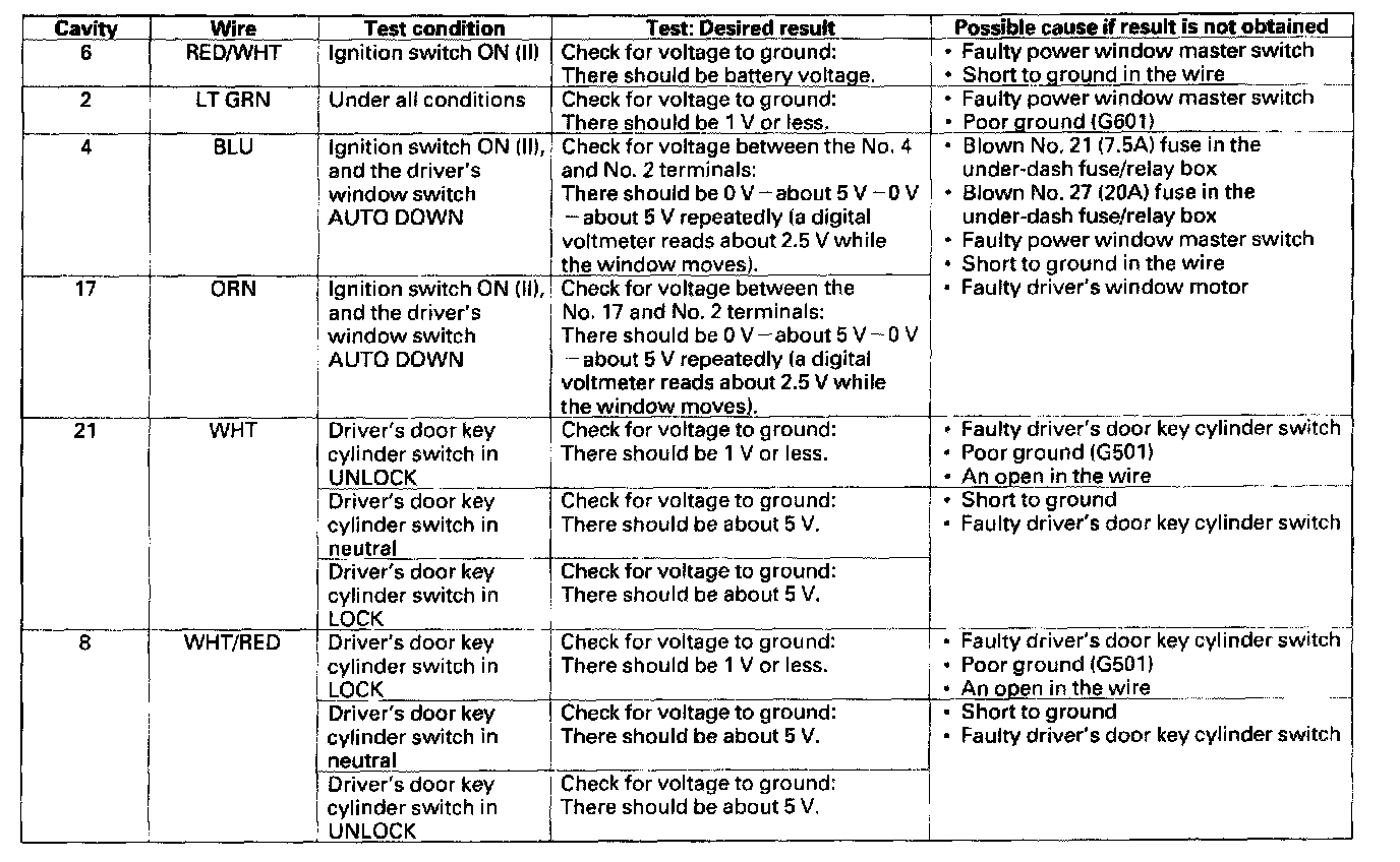 5. With the power window master switch still disconnected, make these input tests at the connector.