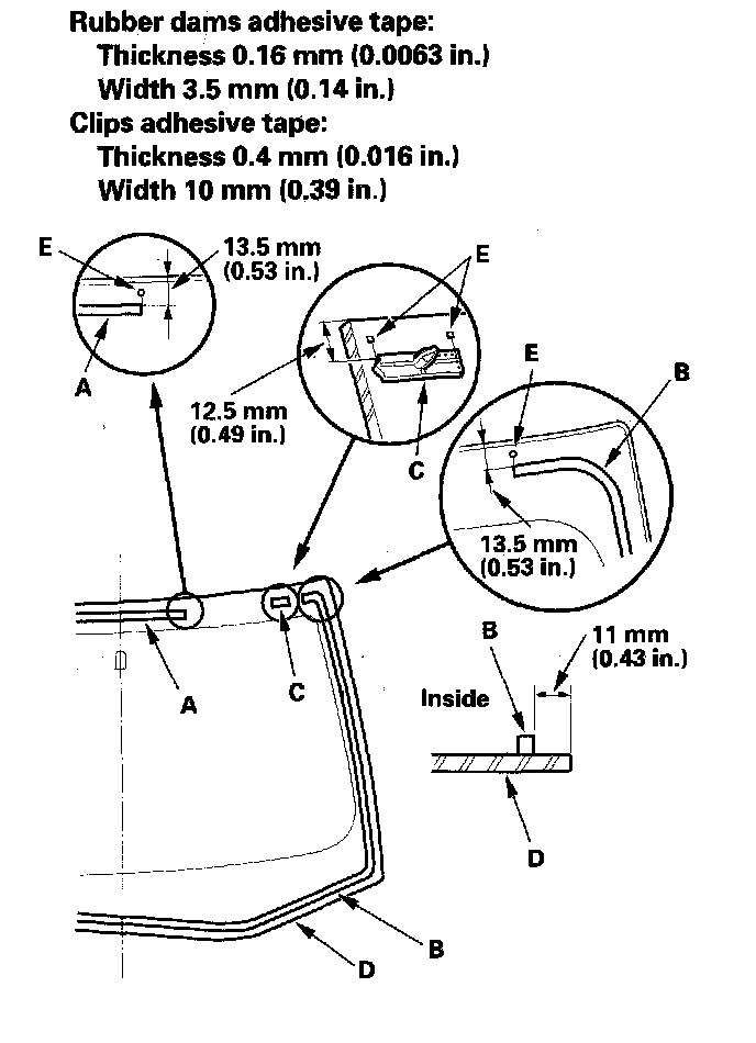 11. Attach the upper rubber dam (A), lower rubber dam (B), and clips (C) with adhesive tape to the inside face of the windshield (D) as shown: