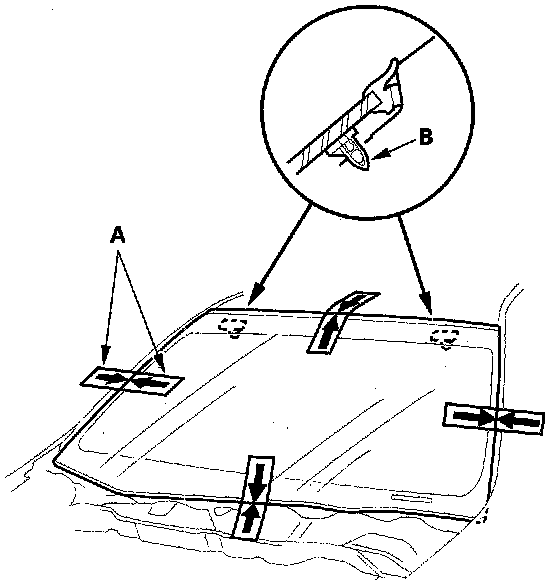 2. Remove the molding (A) from the upper edge of the windshield (B). If necessary, cut the molding with a utility knife.