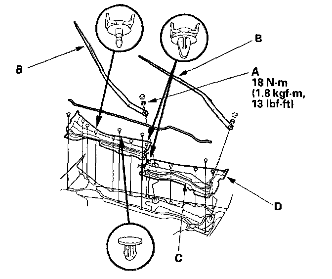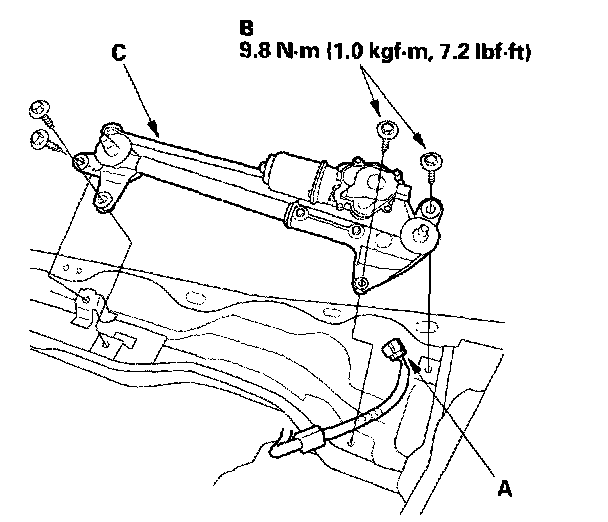4. Remove the four bolts (B) and wiper linkage assembly (C).