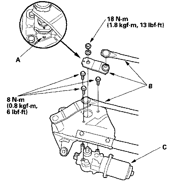 5. Scribe a line (A) across the link and windshield wiper linkage to show the original adjustment. Separate the windshield wiper linkage (B) from the wiper motor (C).