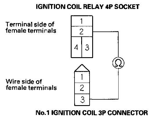 4. Check for continuity between ignition coil relay 4P socket terminal No.2 and the No.1 ignition coil 3P connector terminal No.3.
