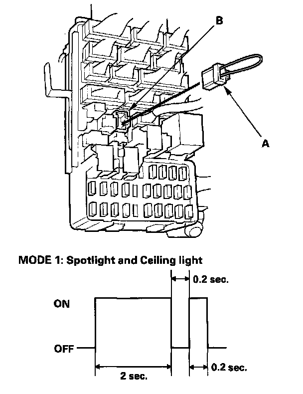 4. Check self-diagnosis function Mode 1 for a diagnostic trouble code (DTC) by connecting the special tool (A) to the multiplex control inspection connector (B). After about 5 seconds, the spotlight and ceiling light should come on for 2 seconds, go out, then blink 0.2 second. This means that you are in Mode 1 of the self-diagnosis function.