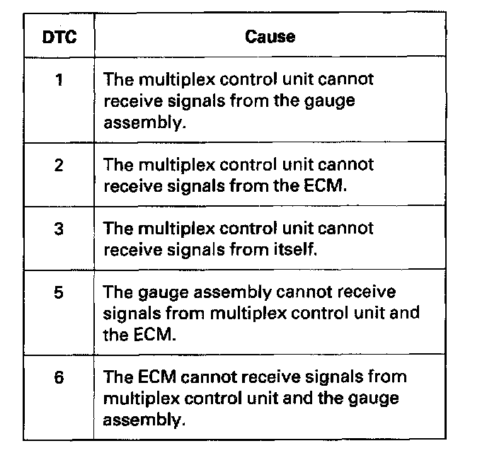 - DTC 1, and 6 simultaneously: Check for an open in the WHT/GRN wire between multiplex control unit terminal KI0 and gauge assembly terminal A2. If the wire is OK, substitute a known-good multiplex control unit, gauge assembly, and ECM one at a time, in that order, and recheck for the DTCs after each substitution.