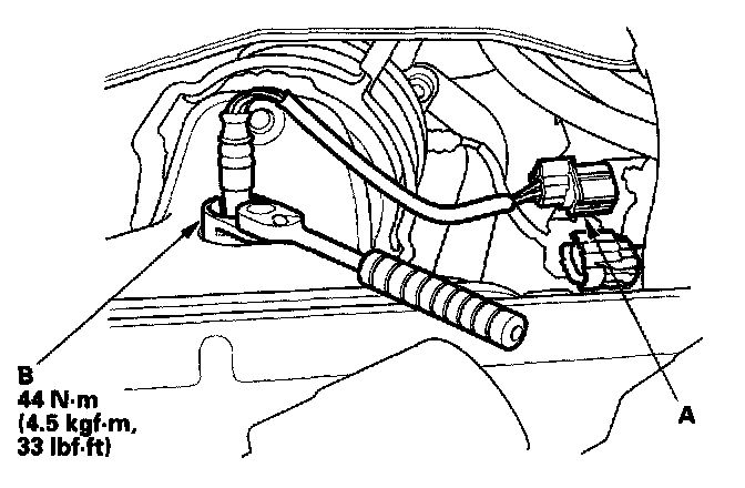 1. Disconnect the A/F sensor 4P connector (A), then remove the A/F sensor (B).