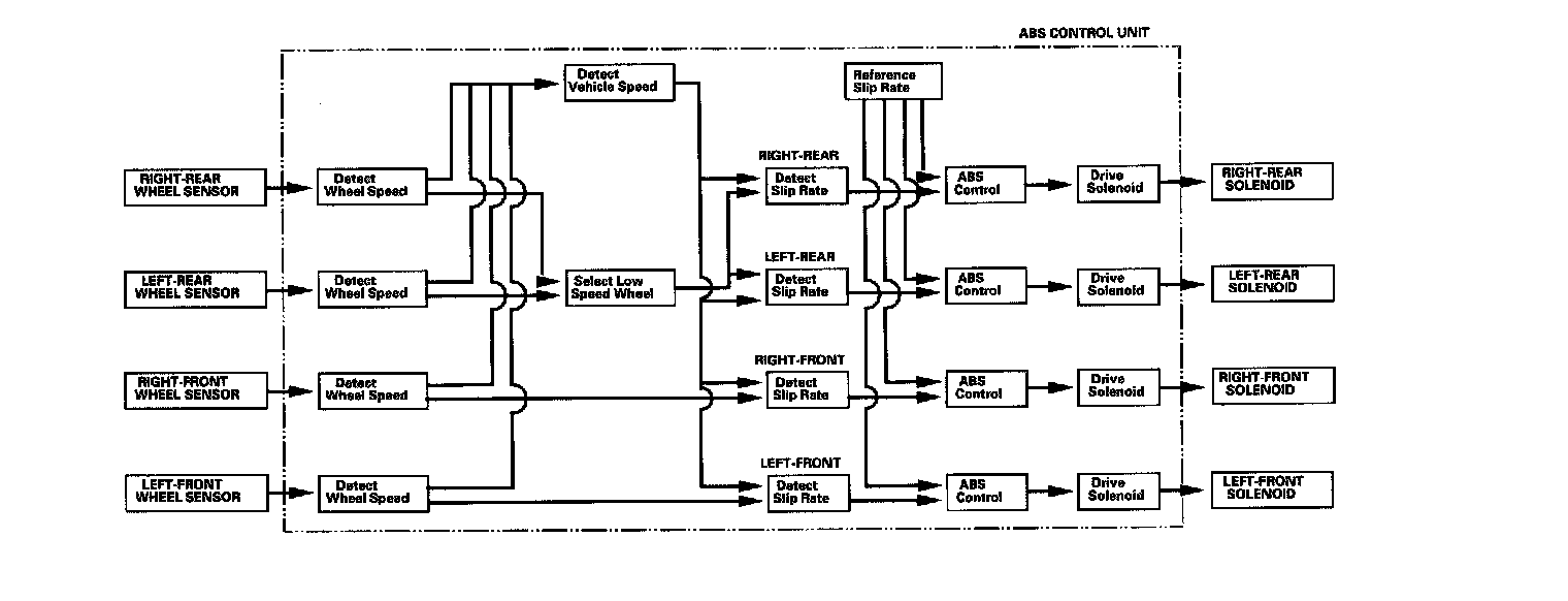 The ABS control unit detects the wheel speed based on the wheel sensor signal it received, then it calculates the vehicle speed based on the detected wheel speed. The control unit detects the vehicle speed during deceleration based on the rate of deceleration.