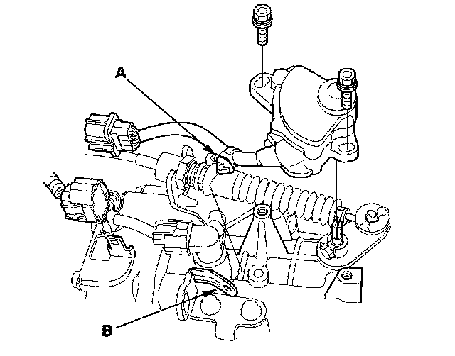5. Disconnect transmission range switch connector, and remove the harness clamp (A) from the clamp bracket (B).