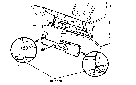3. Remove the bolt. Cut the plastic cross brace in the glove box opening with diagonal cutters in the area shown, and discard it.