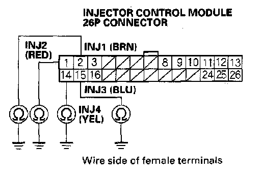 5. Check for continuity between body ground and the injector control module 26P connector terminals No.1, No.2, No.14 and No, 15.