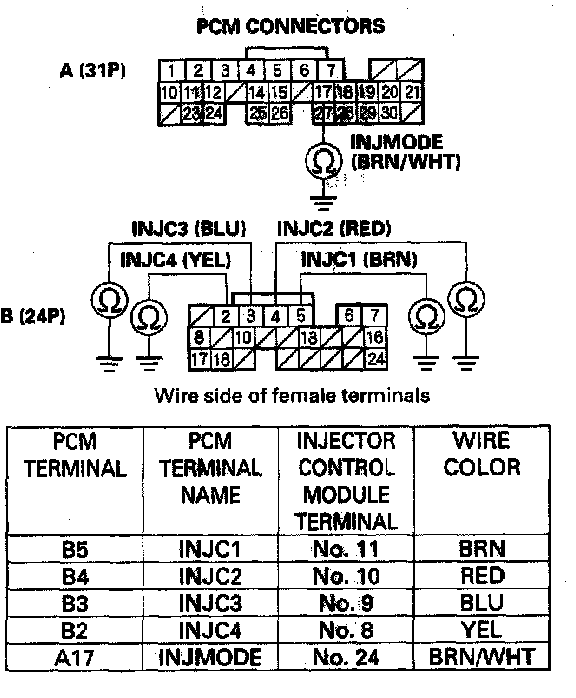 3. Check for continuity between each injectors control module terminal and body ground (see table).