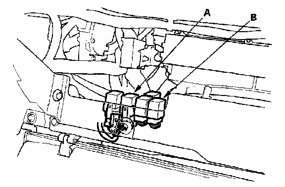 17. Remove the glove box, then remove PGM-FI main relay 1 (A) and the injector relay (B).