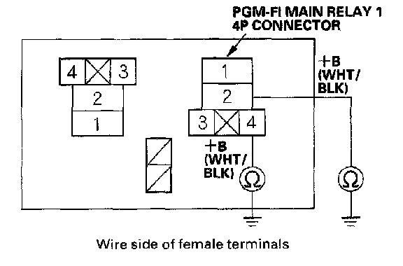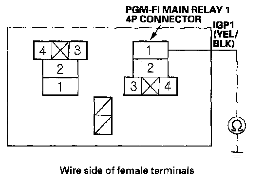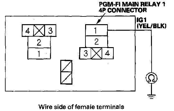 18. Check for continuity between body ground and PGM-FI main relay 1 4P connector terminals No.2 and No.4 individually.
