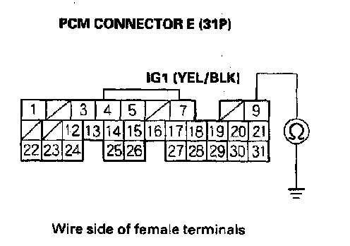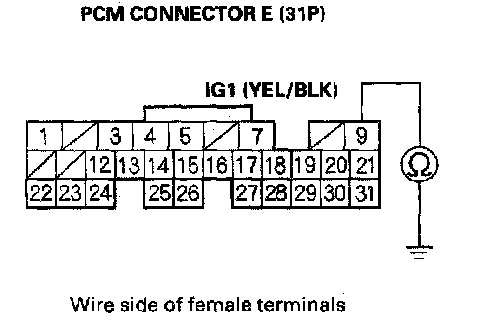 25. Check for continuity between PCM connector terminal E9 and body ground