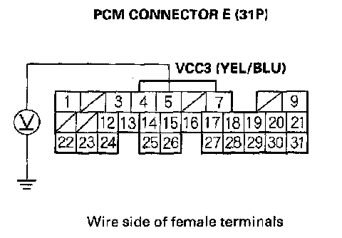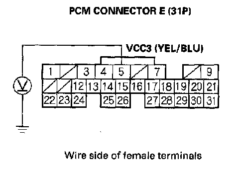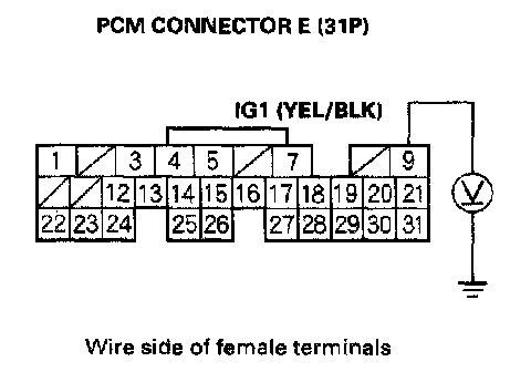 38. Measure voltage between PCM connector terminal E7 and body ground.