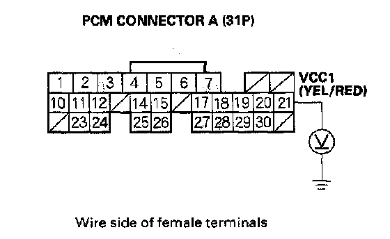 56. Disconnect the 3P connector from each of these sensors, one at a time, and measure voltage between body ground and PCM connector terminal A21 with the ignition switch ON (II).