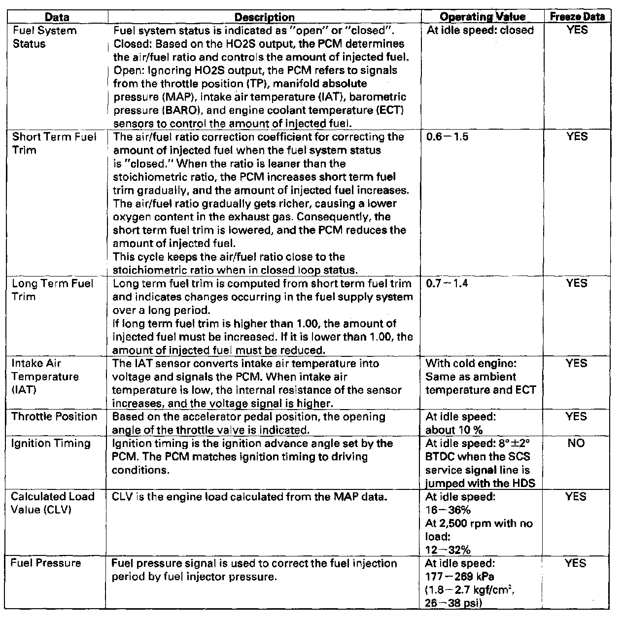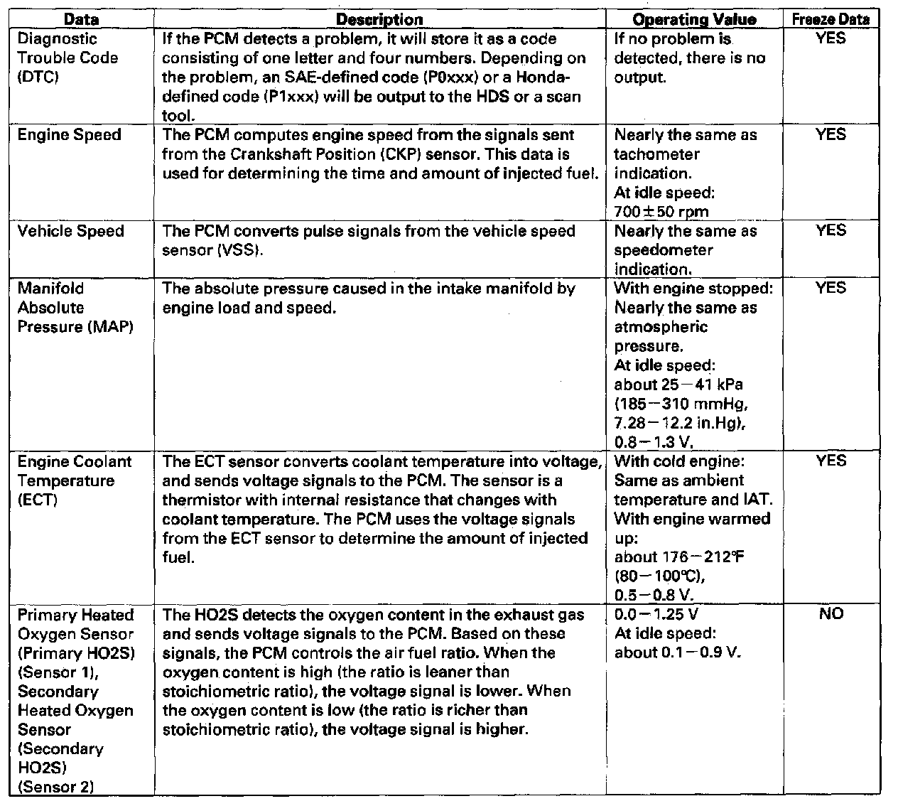You can retrieve data from the PCM by connecting the HDS or a scan tool to the data link connector (DLC). The items listed in the table conform to SAE recommended practice. The HDS also reads data beyond that recommended by SAE to help you find the causes of intermittent problems.