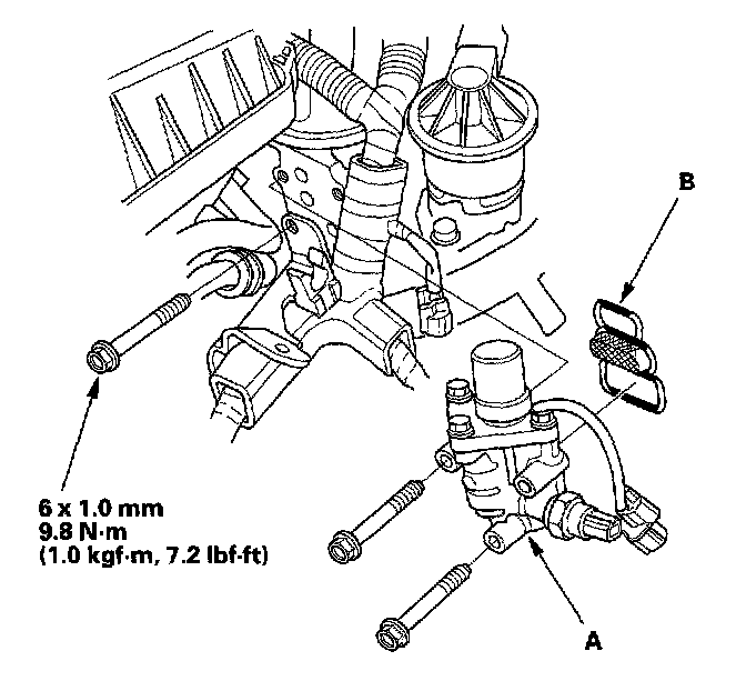 4. If the resistance is within specifications, remove the VTEC solenoid valve assembly (A) from the cylinder head, and check the filter (B) for clogging. If there is clogging, replace the solenoid valve filter, the engine oil filter, and the engine oil.