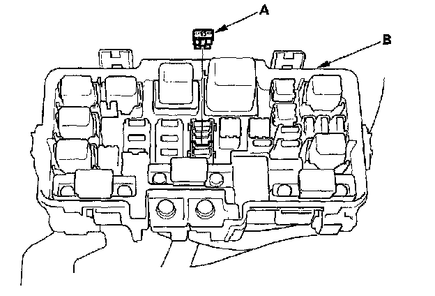 - Turn the ignition switch OFF, and remove the No.6 ECU (PCM) (15A) fuse (A) from the under-hood fuse/relay box (B) for 10 seconds.